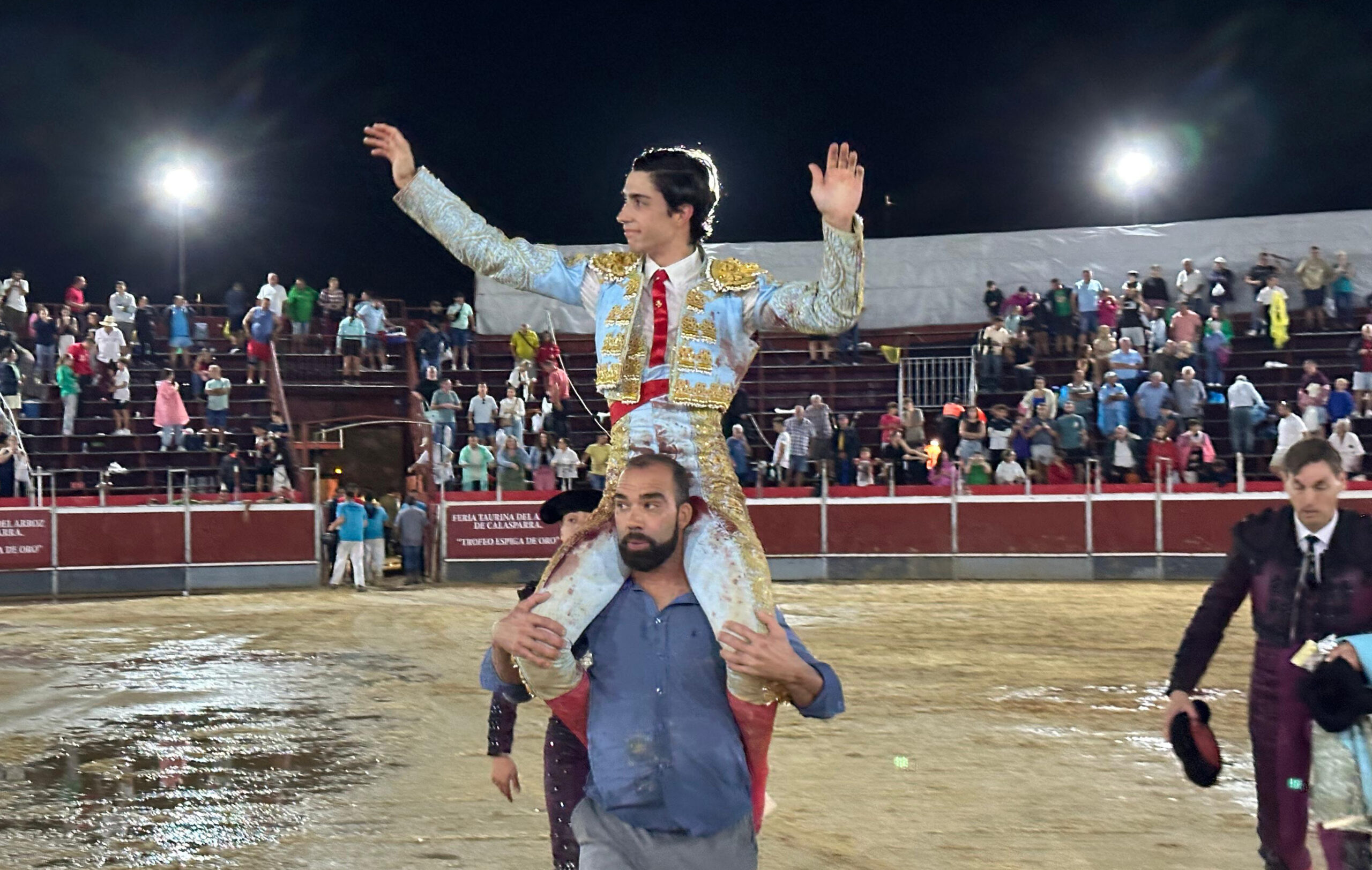 La novillada comenzó con una hora de retraso por las fuertes lluvias. Los areneros hicieron un gran esfuerzo, ayudados por voluntarios del pueblo, y consiguieron adecentar el ruedo.