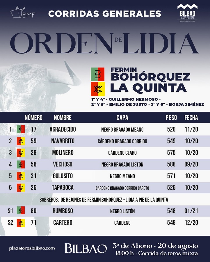 Actualidad TaurinaReseña Festejos «Agradecido» abre la tarde de hoy en Bilbao 20 agosto, 2025 FacebookTwitterPinterestWhatsApp Sorteados y enchiquerados los toros de Fermín Bohórquez y La Quinta para la corrida mixta de hoy en Bilbao Orden de lidia y cuadrillas