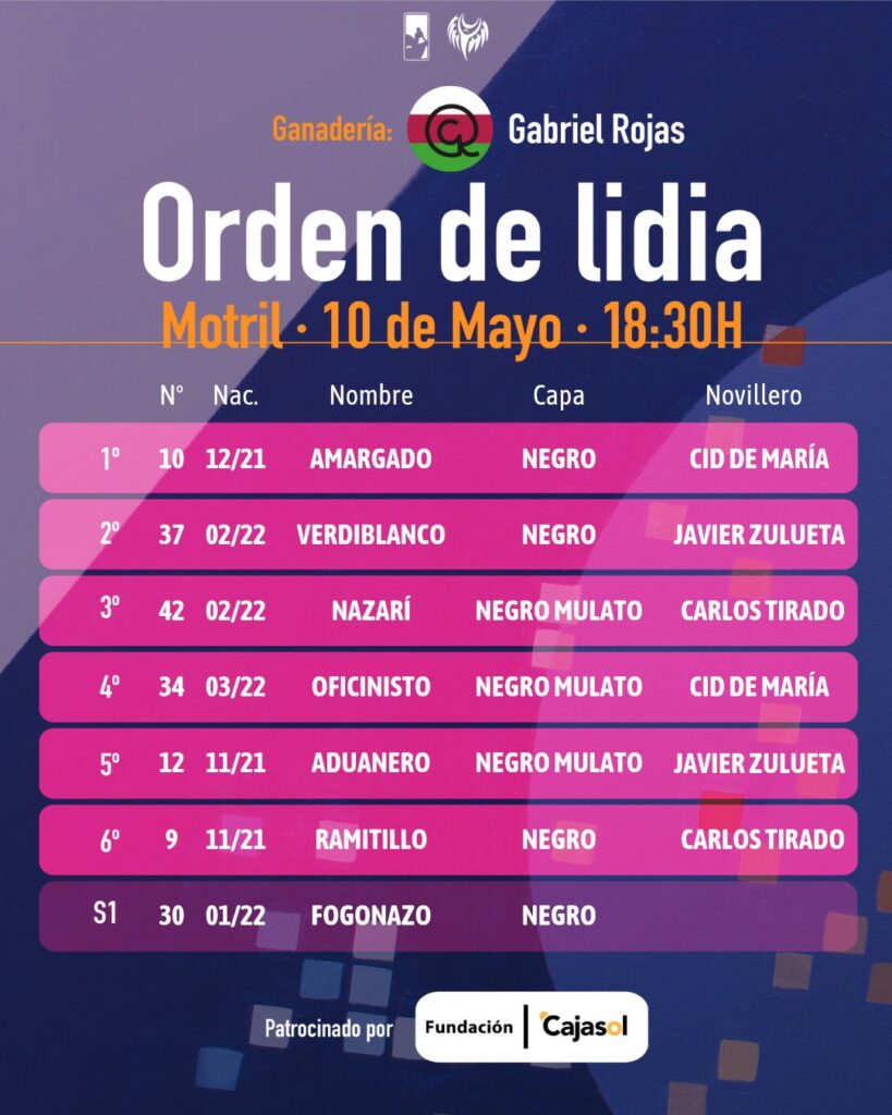 Asi queda el orden de lidia en la tarde de hoy en Motril.