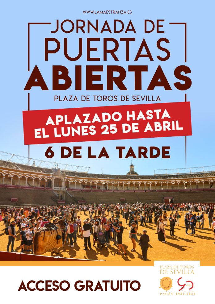 La Empresa Pagés ha decidido aplazar hasta el próximo lunes la celebración de la Jornada de Puertas Abiertas en la Plaza de toros de Sevilla ante la mala previsión meteorológica para mañana viernes, jornada en la que se espera lluvia. Conscientes de la aceptación que tiene esta actividad entre los aficionados, Pagés no ha descartado en ningún momento su suspensión, sino que prefiere cambiar la fecha para poder celebrarla con comodidad para todos los asistentes.
