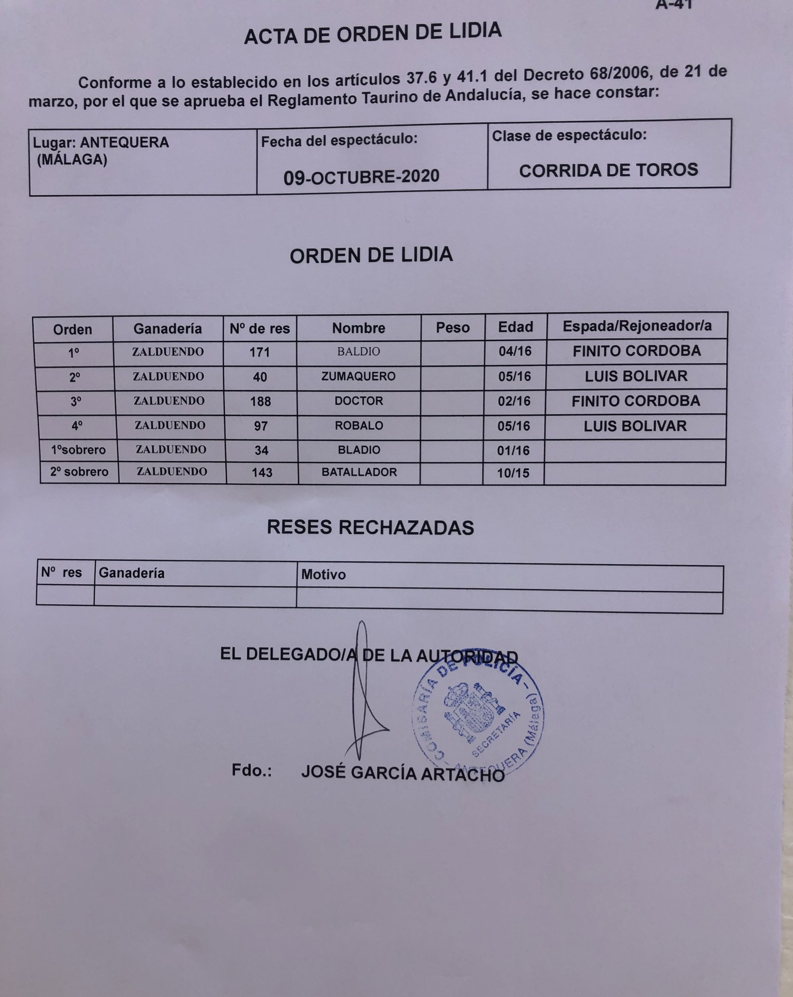 Actualidad TaurinaCovid19Gira Reconstrucción Baldio abre la tarde de Zalduendo en Antequera 9 octubre, 2020 FacebookTwitterPinterestWhatsApp Sorteadas y enchiqueradas las reses de Zalduendo para la tarde de hoy en Antequera ORDEN DE LIDIA