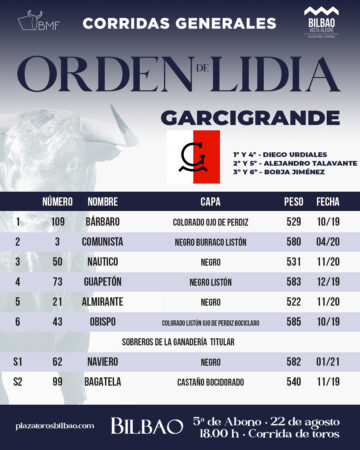 Actualidad TaurinaReseña Festejos «Bárbaro» abre la penúltima de Bilbao 22 agosto, 2025 FacebookTwitterPinterestWhatsApp Sorteados y enchiquerados los toros de Garcigrande para la penúltima de feria en Bilbao Diego Urdiales que sustituye al lesionado Morante de la Puebla, Alejandro Talavante y Borja Jiménez componen el cartel