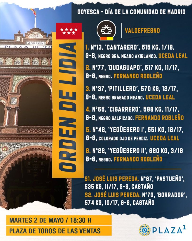 Actualidad TaurinaReseña Festejos Cantarero abre la Goyesca de Las Ventas. 2 mayo, 2023 FacebookTwitterPinterestWhatsApp Sorteadas y enchiqueradas los toros de Valdefresno que serán lidiados, mano a mano, por Uceda Leal y Fernando Robleño, en la corrida Goyesca del 2 de mayo.