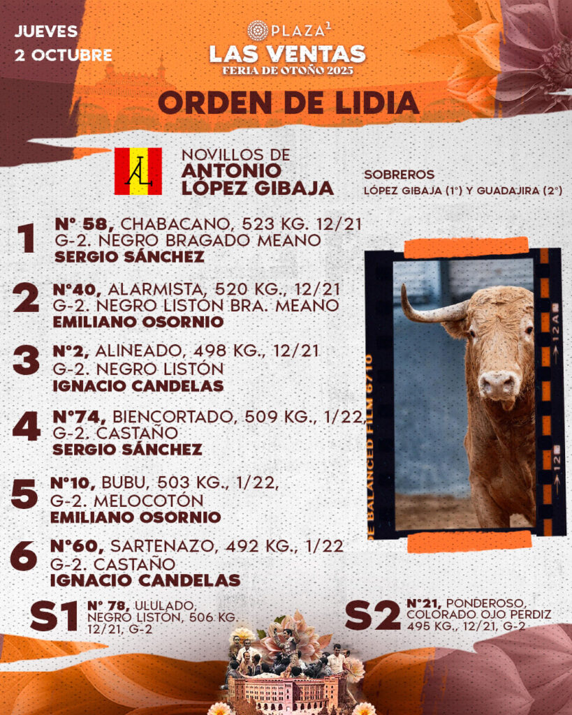 Seis novillos de Antonio López Gibaja ya han sido sorteados y enchiquerados para el primer festejo de la Feria de Otoño. Esta tarde, a las 18h., en la Plaza de Toros de Las Ventas serán lidiados por Sergio Sánchez, Emiliano Osornio e Ignacio Candelas.