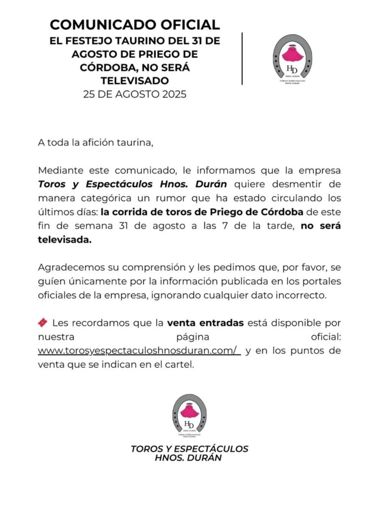 El festejo del próximo domingo, 31 de Agosto, en Priego de Córdoba NO será televisada.