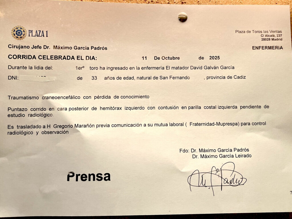 Durante la lidia del 1er° toro ha ingresado en la enfermería El matador David Galván García de 33 años de edad, natural de San Fernando, provincia de Cádiz.