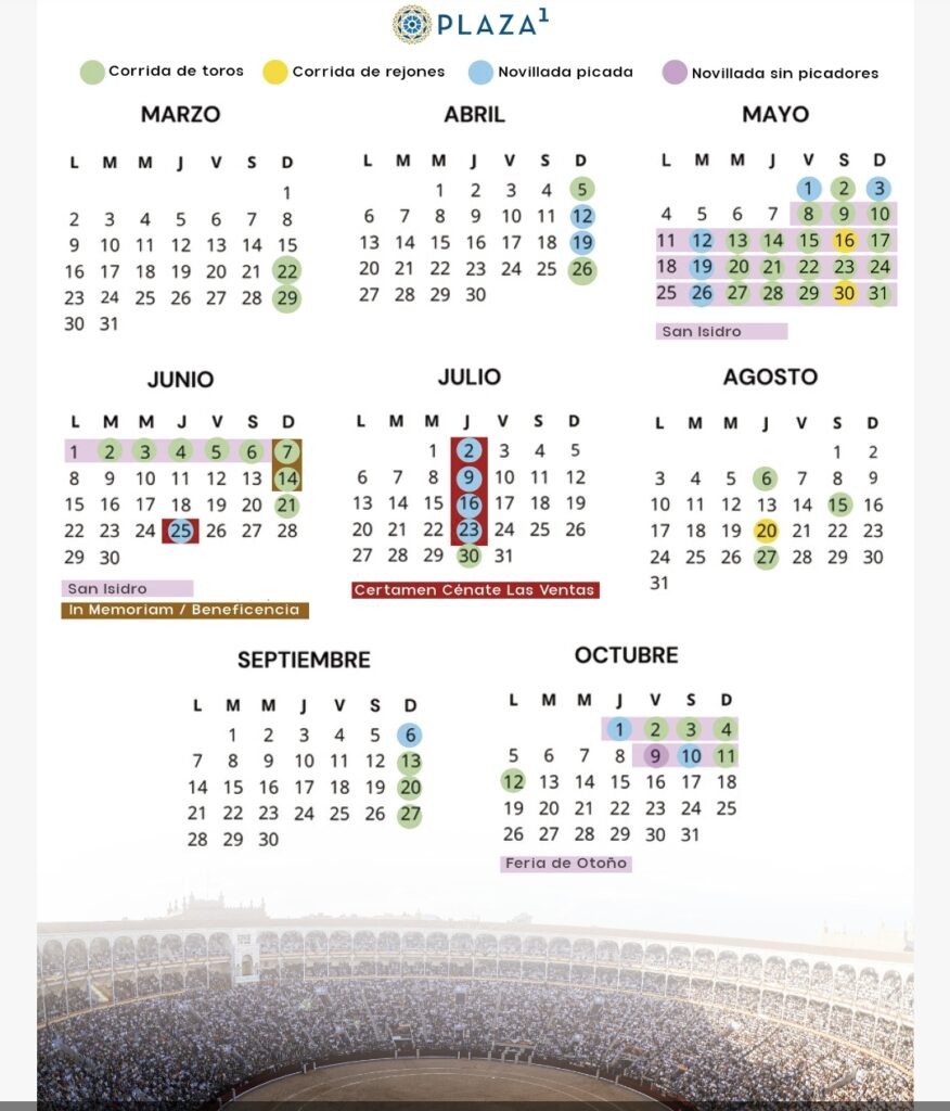 El inicio de la temporada está fijado con corrida de toros para el 22 de marzo. La Feria de San Isidro se celebrará del viernes 8 de mayo al sábado 7 de junio, con los domingos 8 y 14 de junio marcados en rojo con la celebración de las corridas In Memoriam y Beneficencia. Una corrida de toros más, el domingo 21 de junio, servirá de antesala al Certamen de novilladas nocturnas ‘Cénate Las Ventas’.