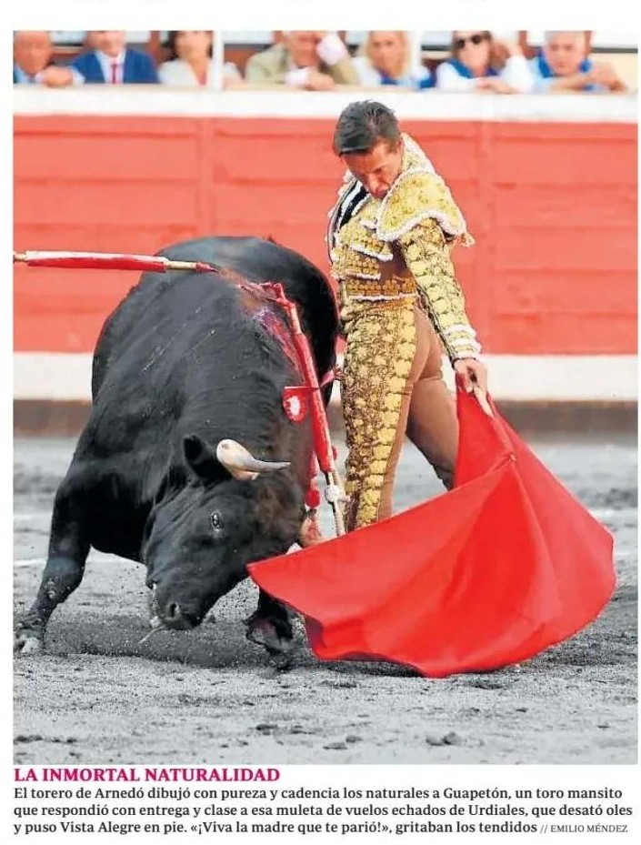 De acuerdo con lo señalado por el jurado del premio Desteñido, la crónica de Gonzalo I. Bienvenida publicada el día 23 de agosto en las páginas de El Mundo ha sabido transmitir de manera vehemente la reivindicación en Bilbao de la figura inmensa de Diego Urdiales. El título de su crónica (“Una faena antológica como revancha”), nos acerca a un torero que, habiendo ofrecido grandes tardes en Bilbao, entra por la vía de la sustitución de Morante de la Puebla al abono bilbaíno, y lo hace para reclamar que es un matador de culto, más allá del circuito y de sus modas y fiel a un estilo donde prima la pureza.