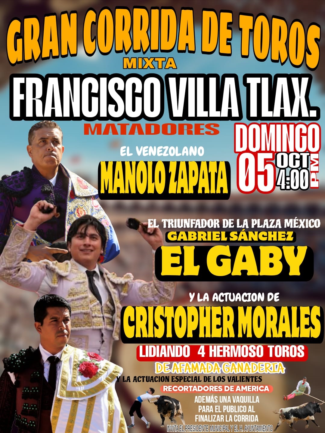 La presencia de Zapata, en este cartel mixto llega precedida por su reciente actuación del pasado lunes 29 de septiembre de 2025 en la Plaza de Toros Portátil de la Colonia Lázaro Cárdenas, en Presas, Hidalgo, escenario donde consiguió cortar una oreja. El diestro suramericano en esta ocasión hará el paseíllo junto a Gabriel Sánchez «El Gaby», completando la terna Christopher Morales, quien se une al cartel para mostrar su valía y confirmar su proyección en esta importante plaza. Morales viene de triunfar en Presas, Hidalgo, donde salió por la puerta grande.