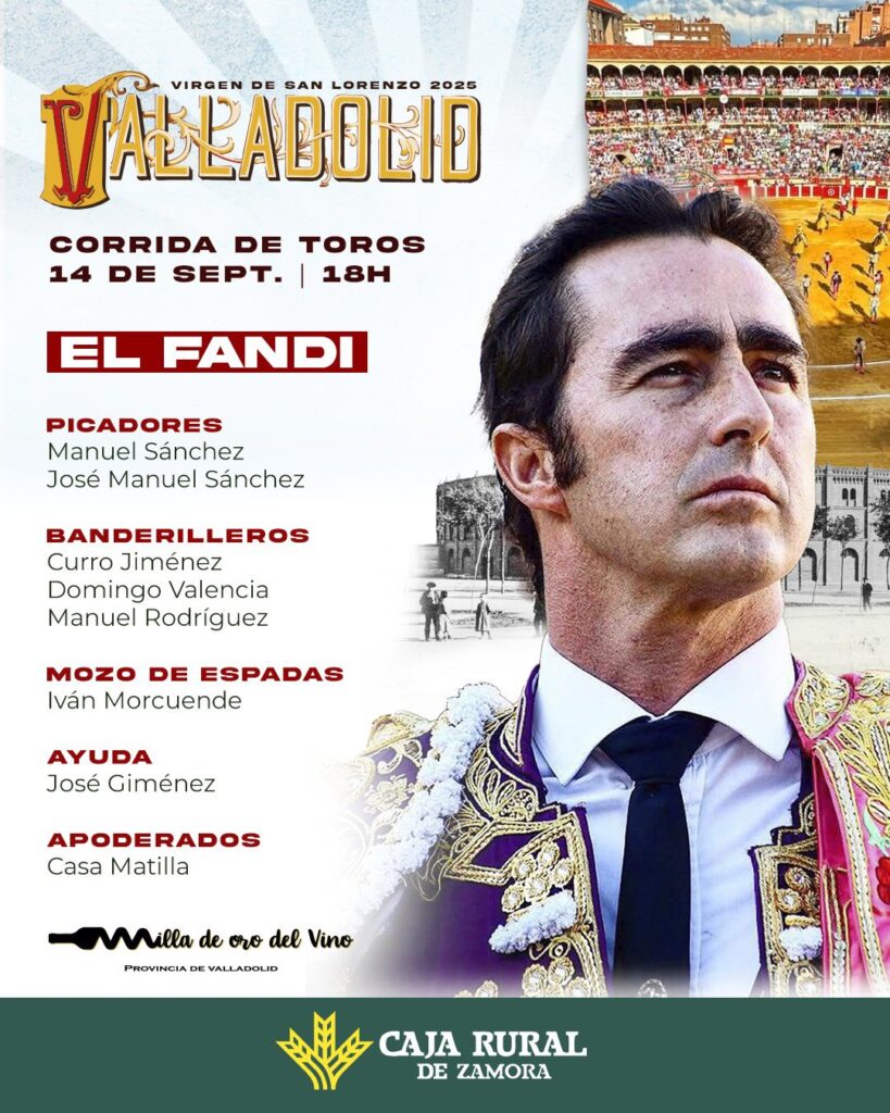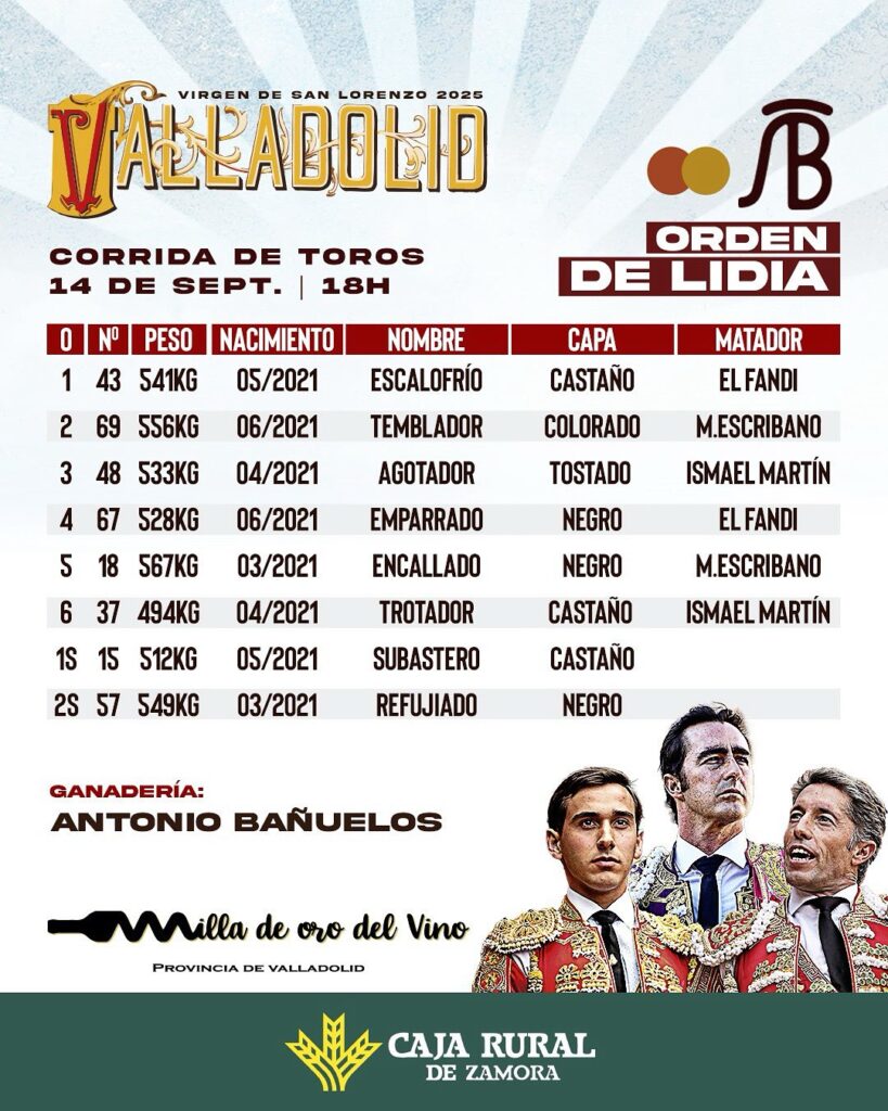 Actualidad TaurinaReseña Festejos «Escalofrío» abre la tarde en Valladolid 14 septiembre, 2025 FacebookTwitterPinterestWhatsApp Orden de lidia de los toros de Antonio Bañuelos para esta tarde: 𝗘𝗹 𝗙𝗮𝗻𝗱𝗶, 𝗠𝗮𝗻𝘂𝗲𝗹 𝗘𝘀𝗰𝗿𝗶𝗯𝗮𝗻𝗼 𝗲 𝗜𝘀𝗺𝗮𝗲𝗹 𝗠𝗮𝗿𝘁𝗶n.