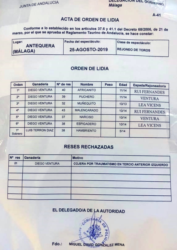 Actualidad TaurinaReseña Festejos Espigadero cierra la feria de Antequera 25 agosto, 2019 FacebookTwitterPinterestWhatsApp Sorteadas y enchiqueradas las reses de Diego Ventura para la segunda de la Feria taurina de Antequera Los rejoneadores Rui Fernandes, Diego Ventura y Lea Vicens serán los encargados de su lidia. Orden de lidia para esta tarde
