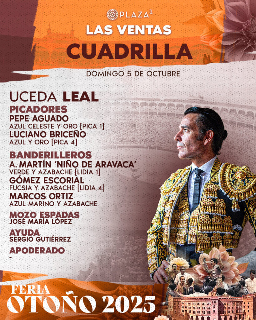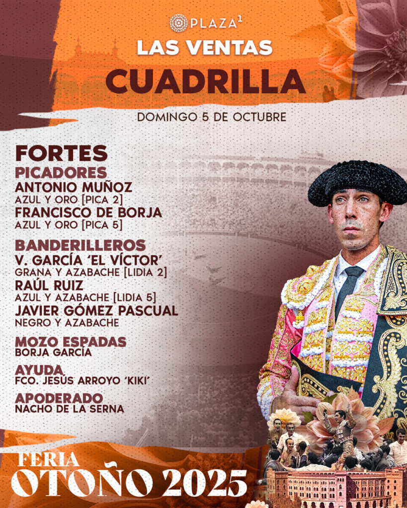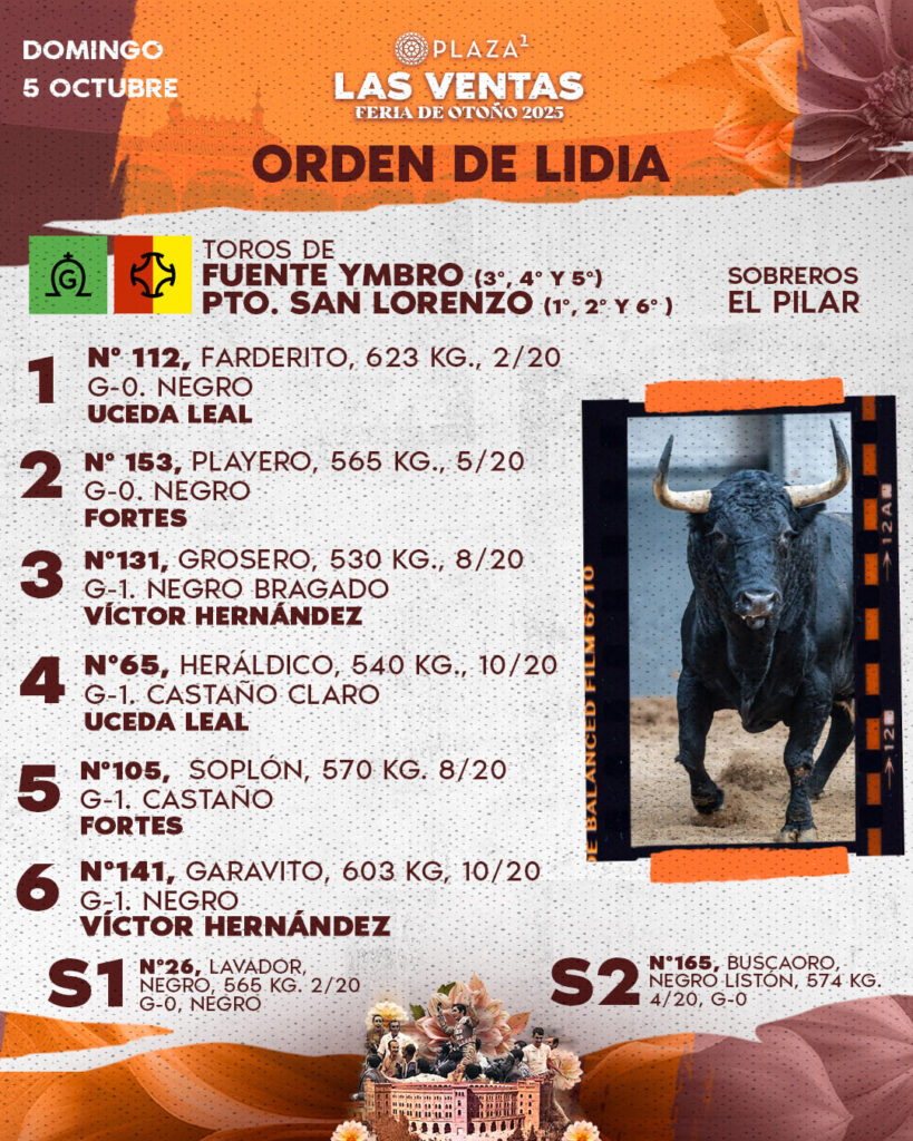 Ya han sido sorteados y enchiquerdos tres toros de Puerto de San Lorenzo (1º, 2º y 6º) y tres de Fuente Ymbro (3º, 4º y 5º) para la cuarta cita de la Feria de Otoño. Esta tarde, en la Plaza de Toros de Las Ventas, a las 18h. harán el paseíllo Uceda Leal, Fortes y Víctor Hernández.