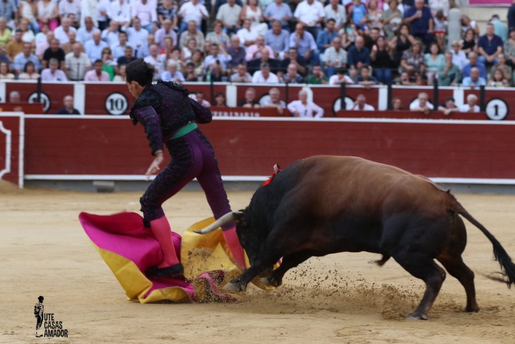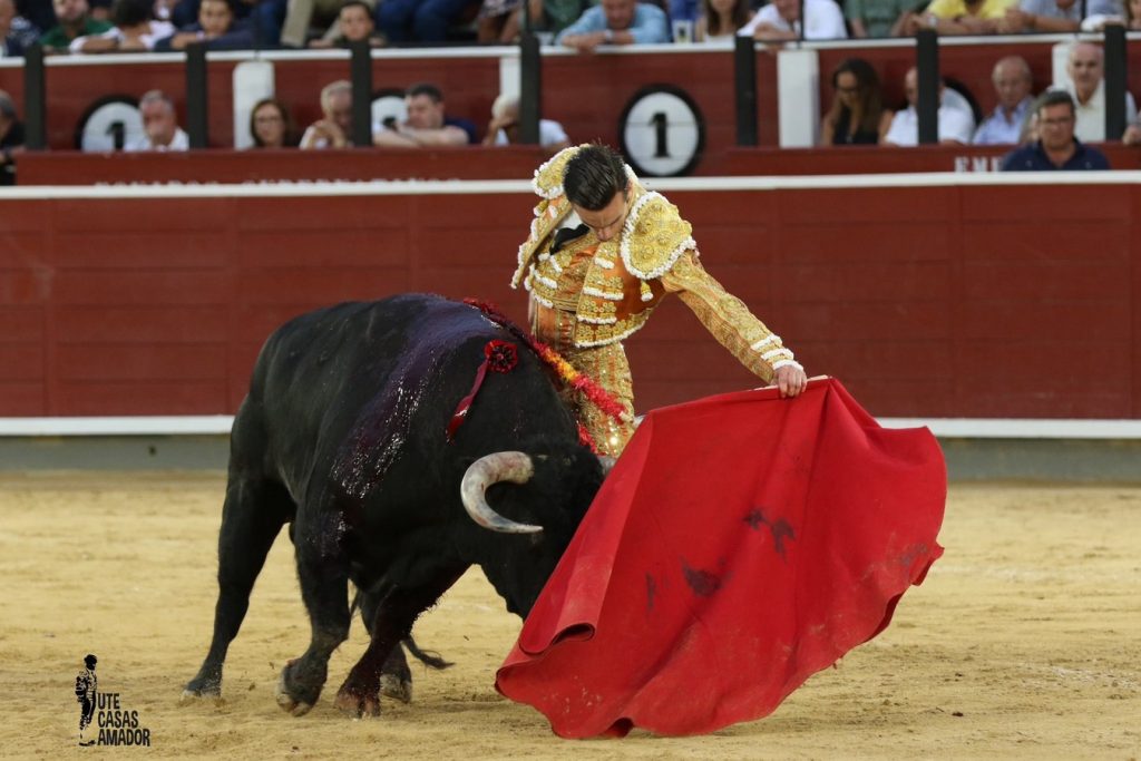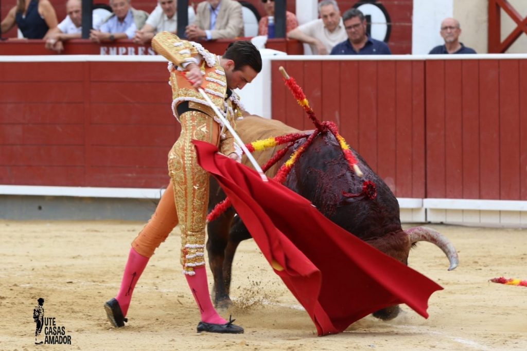 4º ‘Guardamonte’, nº 24. También se fue a portagayola Fortes en el cuarto de la tarde, siendo volteado con fuerza al no obedecer el astado para el farol que pretendía darle. Después le enjaretó un magnífico manojo de verónicas, de mucha pureza. Faena de peso del diestro malagueño, de entrega, de pureza, de autenticidad. Ni se miró Saúl en la herida que llevaba en la cara y que le llenaba de sangre esa parte del rostro. El trasteo destacó fundamentalmente por las series que instrumentó con la derecha, quedándose en el sitio, toreando con la panza y ofreciéndole los muslos una y otra vez. Seria actuación, sin concesiones a la galería de Fortes, al que le acariciaron los serios pitones de su antagonista en la parte final de su obra muleteril. Estocada a ley. Oreja.