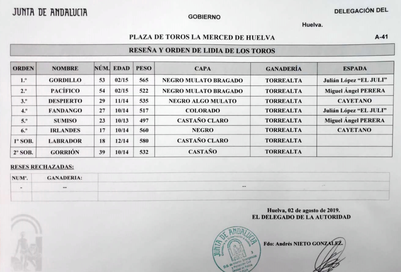 Actualidad TaurinaESPECIAL COLOMBINAS 2019Reseña Festejos Gordillo abre la tarde de Torrealta en La Merced 2 agosto, 2019 FacebookTwitterPinterestWhatsApp Sorteadas y enchiqueradas las reses de Torrealta para la segunda de abono de Colombinas 2019. Los espadas Julián López “El Juli”, Miguel Ángel Perera y Cayetano trenzarán el paseíllo a las 20.00 horas. Orden de lidia para esta tarde