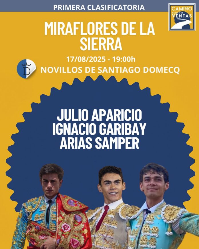 Este domingo 17 de agosto se ha celebrado en Miraflores de la Sierra la primera novillada clasificatoria del Certamen de novilladas sin picadores ‘Camino hacia Las Ventas’. En ella han participado Ignacio Garibay, alumno de la Escuela YiyoJulio Aparicio, de la Fundación El Juli, y Arias Samper, de CITAR- Anchuelo. Se lidiaron erales de Santiago Domecq, de buen juego en su conjunto. En esta primera cita los tres alumnos actuantes ofrecieron un buen nivel; sin embargo, fue Ignacio Garibay el alumno que despuntó en todos los aspectos valorables, obteniendo así la mayor puntuación de la tarde con un total de 7,79 y situándose como primer líder de la clasificación.