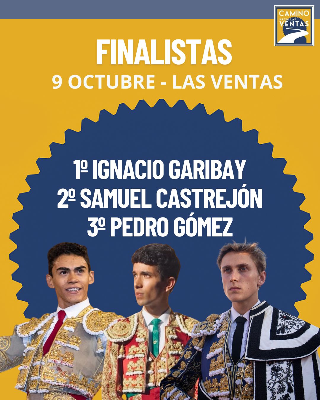 Concluida la última novillada clasificatoria celebrada esta mañana en Boadilla del Monte, el Certamen de novilladas sin picadores “Camino hacia Las Ventas” ha definido sus tres finalistas. Ignacio Garibay y Samuel Castrejón, de la Escuela Yiyo, y Pedro Gómez, de la Escuela de Galapagar, son los tres clasificados que logran el billete para la final del próximo jueves 9 de octubre (18:00 h) en la Plaza de Toros de Las Ventas.