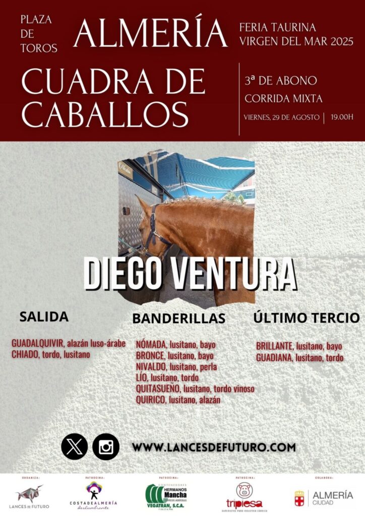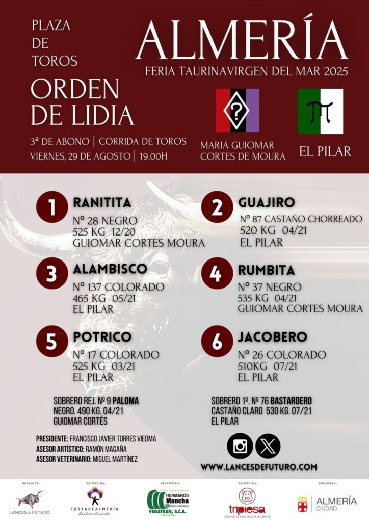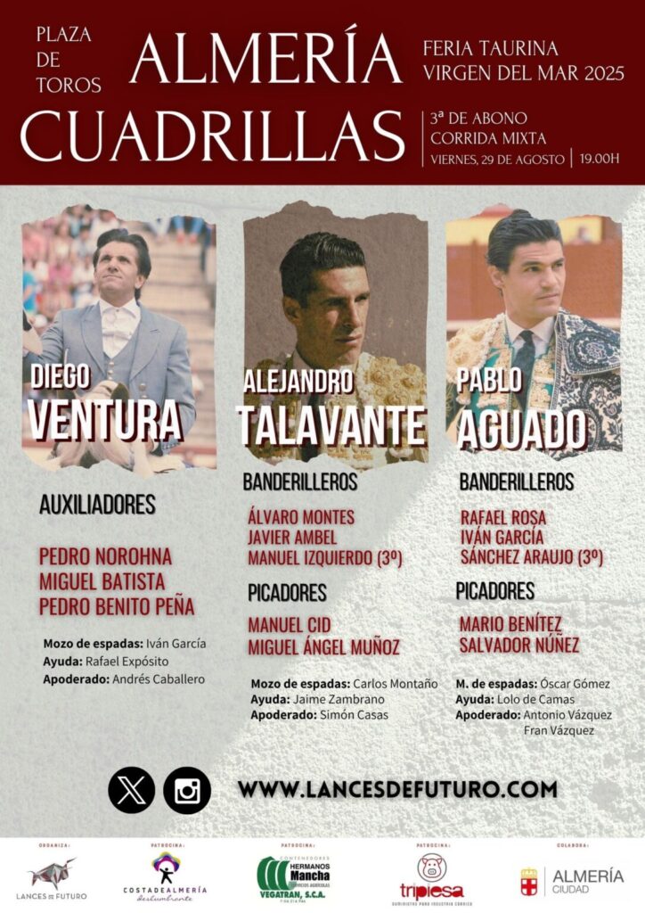 Actualidad TaurinaReseña Festejos «Jacobero» cierra la feria de Almería 2025 29 agosto, 2025 FacebookTwitterPinterestWhatsApp Sorteados y enchiquerados los toros de María Guiomar para Diego Ventura y toros de El Pilar para Alejandro Talavante y Pablo Aguado.