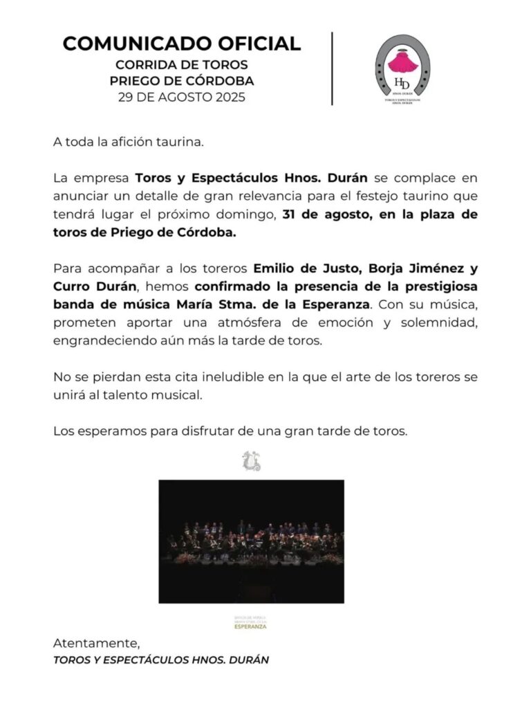 El festejo del próximo domingo, 31 de Agosto, en Priego de Córdoba contará con la presencia de la prestigiosa Banda de Música María Santísima de la Esperanza de Córdoba.