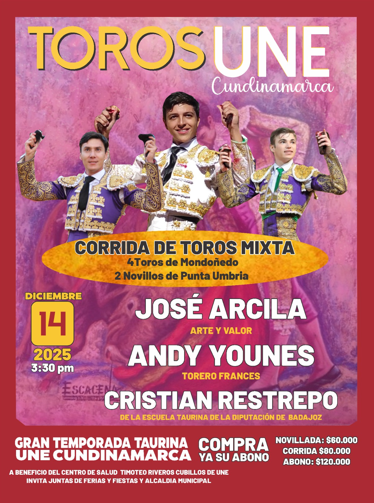 El próximo 14 de diciembre, la plaza de toros de Subachoque será escenario de una corrida mixta que promete conjugar arte, juventud y solidaridad. El festejo, parte de la gran temporada taurina de UNE Cundinamarca, reunirá a tres toreros de perfiles contrastantes: el colombiano anunciado en la Feria de Cali, José Arcila, su paisano el joven Cristian Restrepo —formado en la Escuela Taurina de la Diputación de Badajoz— y el debutante en estás tierras, el francés Andy Younes, quien llega con credenciales de toreo clásico, dominio técnico y una estética que ha conquistado públicos en Europa y América.