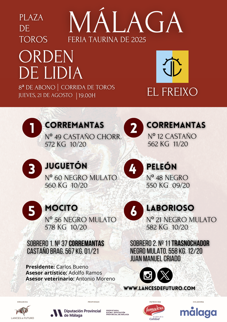 El orden de lidia, cuadrillas y los toros de esta tarde son los siguientes