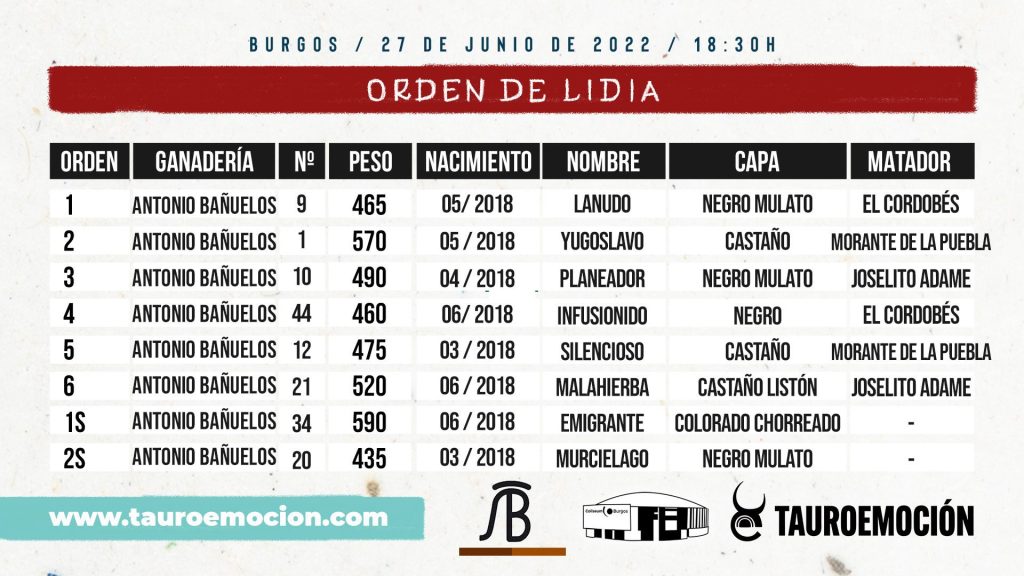 Actualidad TaurinaCovid19ESPECIAL FERIA BURGOS 2022Reseña Festejos Lanudo abre la tercera de abono en Burgos 27 junio, 2022 FacebookTwitterPinterestWhatsApp Sorteados y enchiquerados los toros de Antonio Bañuelos para la tercera de abono en Burgos “?? ????????” vuelve a los #Sampedros2022 con «Lanudo» de ??????? ??ñ????? junto a ??????? ?? ?? ?????? ? ???????? ????? a las 18:30 horas.