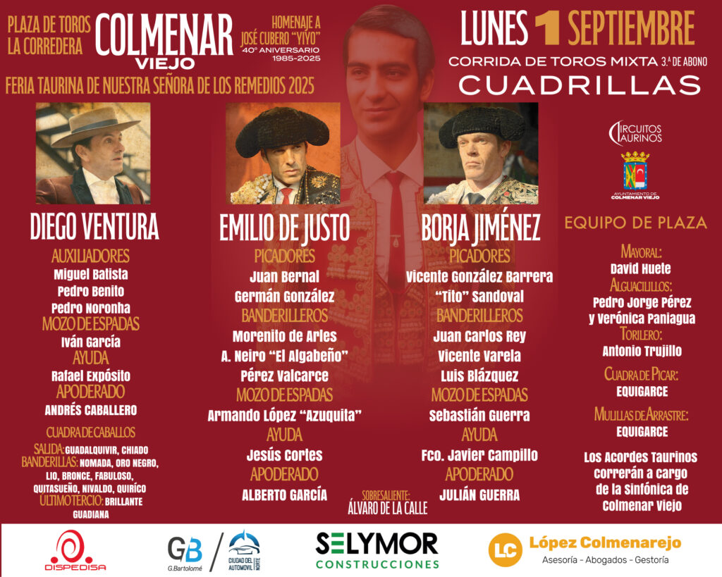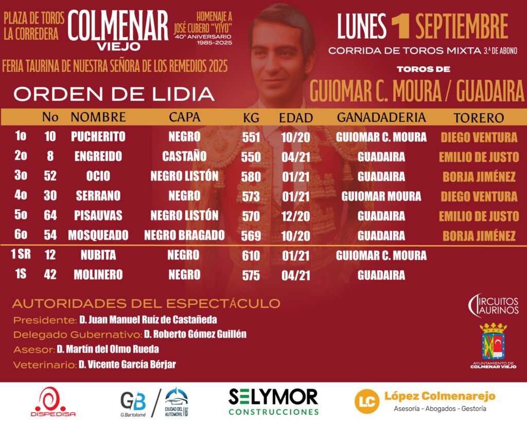 El rejoneador Diego Ventura y los matadores Emilio de Justo y Borja Jiménez serán los encargados de su lidia. El sobrero de rejones pertenece a la ganadería de portuguesa de Guiomar Cortés de Moura y el de a pie a la de Guadaira.
