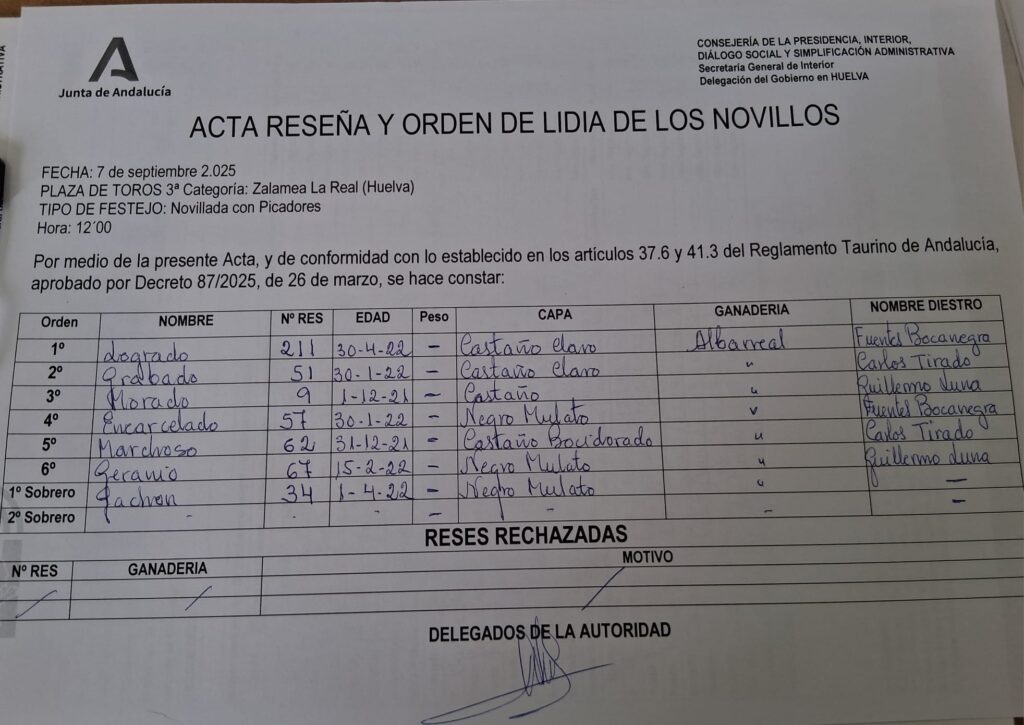 Sorteados y enchiquerados los novillos de la ganadería onubense de Albarreal para el festejo de su feria taurina que se celebra en la tarde de hoy 7 de septiembre.