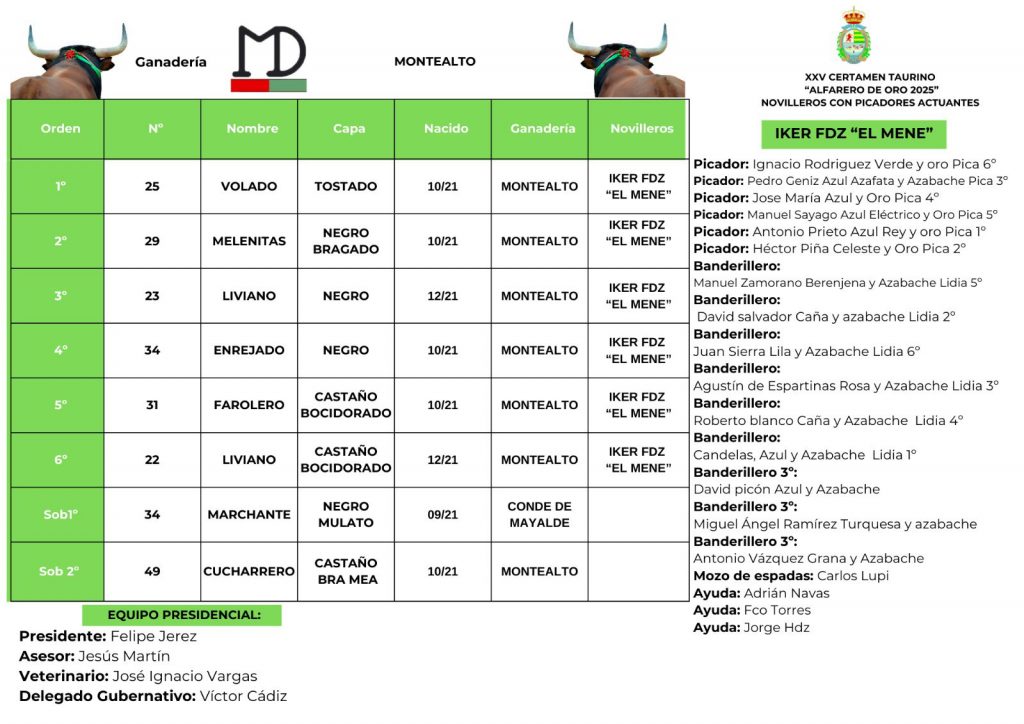 Ante la baja por lesión de Aarón Palacio, Iker Fernández ‘El Mene‘ dará cuenta en solitario de los seis ejemplares de la vacada de Montealto reseñados para Villaseca de la Sagra.
