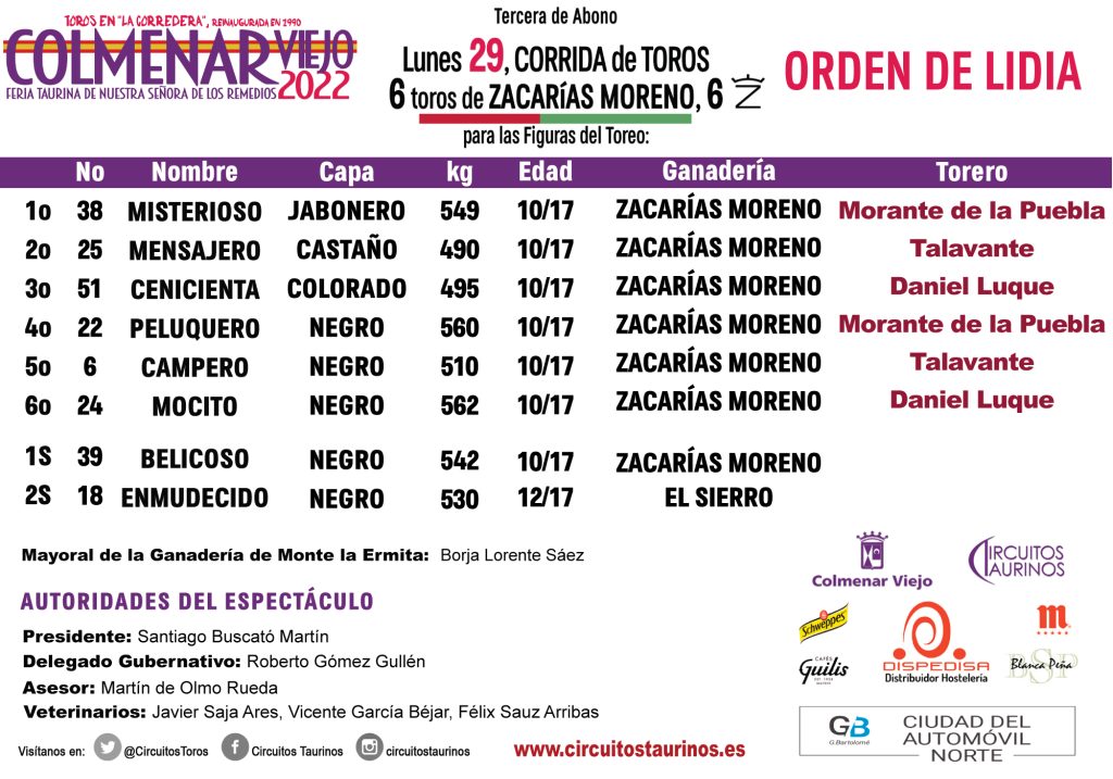 Esta mañana fueron sorteados los toros de la ganadería de Zacarías Moreno para ser lidiados esta tarde en el tercer festejo de abono de la Feria Taurina de Nuestra Señora de Los Remedios de Colmenar Viejo, por los diestros Morante de la Puebla, Alejandro Talavante y Daniel Luque.