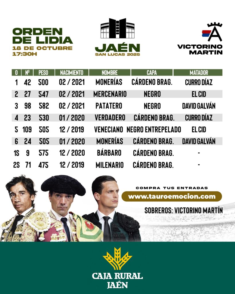 Actualidad Taurina Monerías abre la tarde en Jaén 18 octubre, 2025 FacebookTwitterPinterestWhatsApp Sorteados y enchiquerados los los toros de Victorino Martín para esta tarde en Jaén. A las 17:30h Curro Díaz, «El Cid» y David Galván para cerrar la feria taurina de San Lucas 2025.
