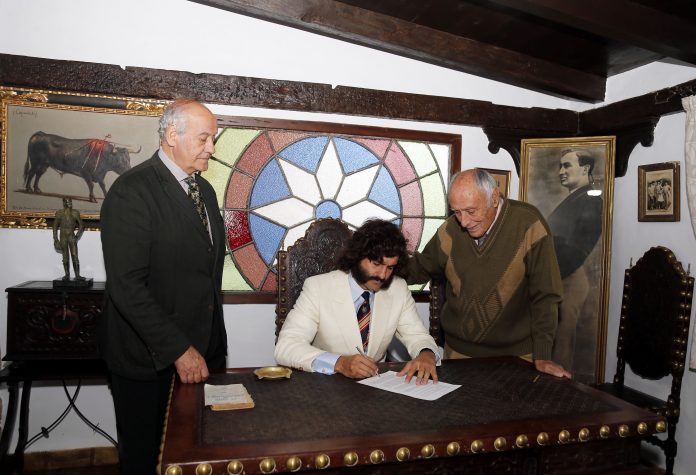 Como puede apreciarse en la imagen, el apoderado Manolo Lozano cedió los trastos al propio matador para que fuera éste quien suscribiera el contrato, y el mismo fue rubricado en el escritorio que perteneció en su día a Joselito El Gallo y que hoy es propiedad del diestro de La Puebla.
