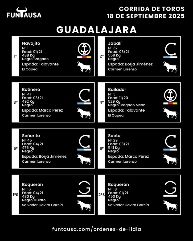 Actualidad TaurinaReseña Festejos «Navajito» abre la tarde en Guadalajara. 18 septiembre, 2025 FacebookTwitterPinterestWhatsApp Sorteados y enchiquerados los toros El Capea, Carmen Lorenzo Carrasco y Salvador Gavira García para la tarde de hoy en Guadalajara. La terna está formada por Alejandro Talavante, Borja Jiménez y Marco Pérez.
