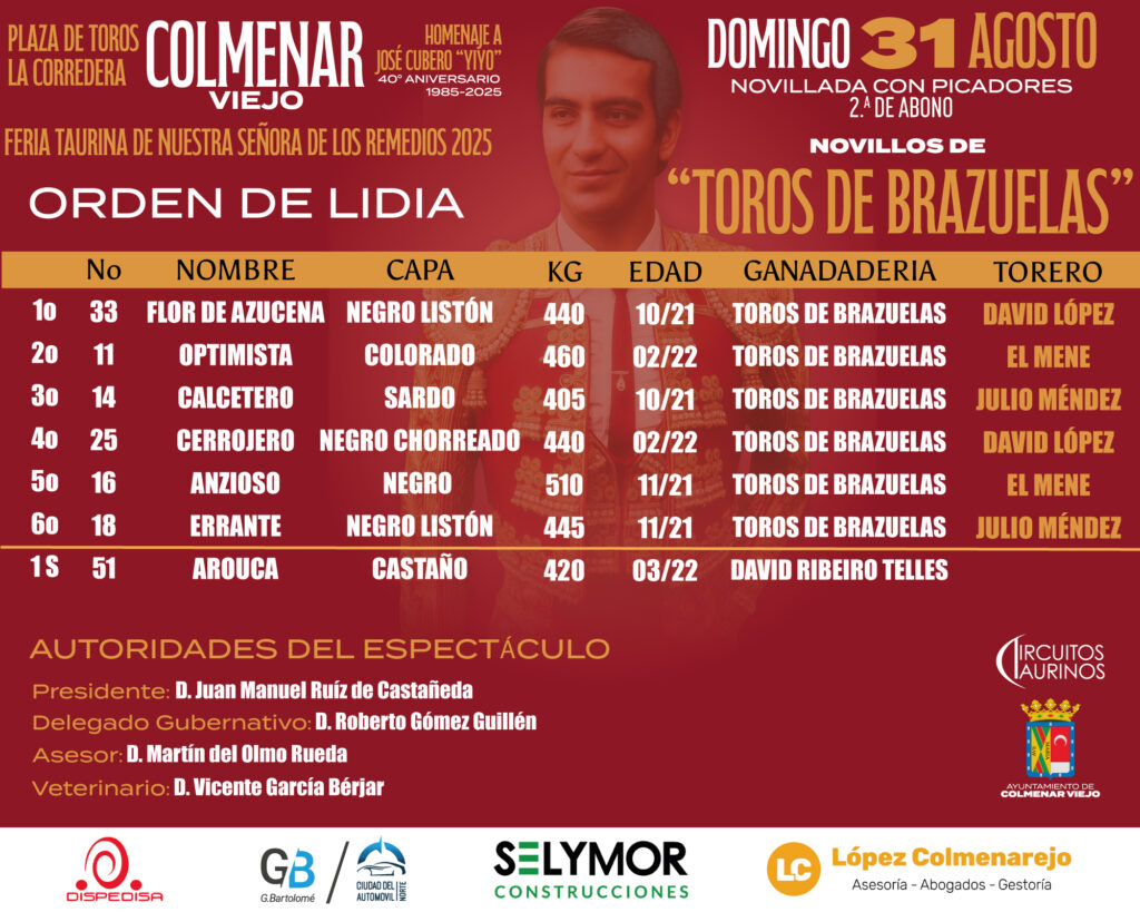 Este es el orden de lidia y la relación completa de las cuadrillas que intervendrán en el espectáculo y las autoridades que regirán el mismo: