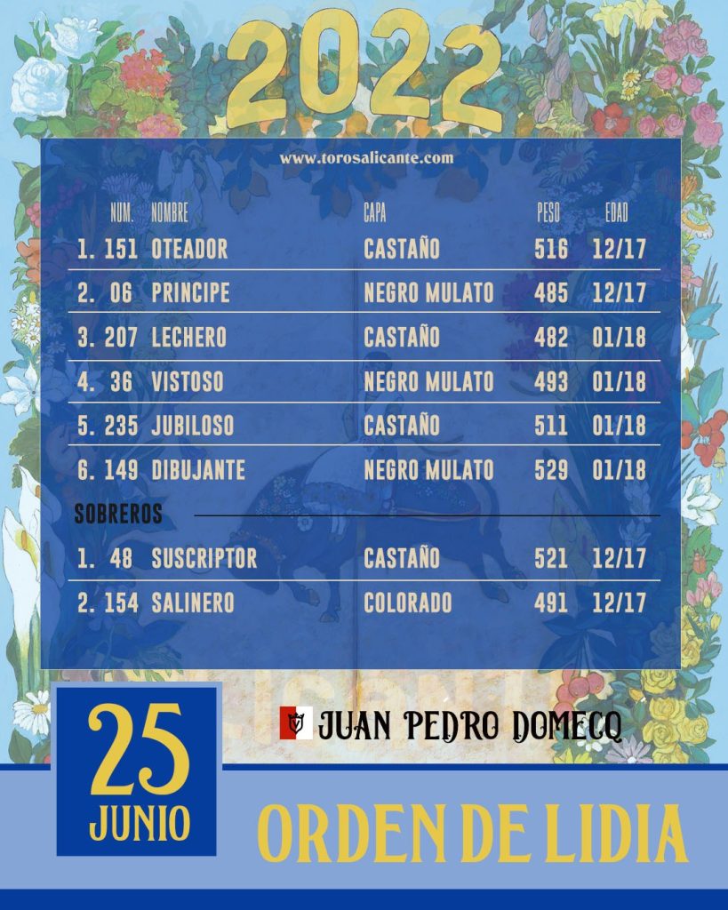 Sorteados y enchiquerados los Toros de Juan Pedro Domecq para el festejo de esta tarde en Alicante.