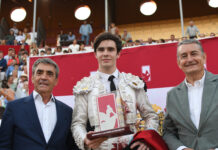 Segundo festejo de abono que no olvidarán los espectadores que se dieron cita llenado los tendidos del coso para ser testigos de la despida de Padilla que fue cogido de fea manera al entrar a matar y le arrancó el pañuelo que protege su reciente herida. No se quedó tampoco sin su susto el limeño Roca Rey que dio una gran dimensión, sumando otra puerta grande esta temporada. No fue la tarde del sevillano de la Puebla, Morante para más señas, quien escuchó los tres avisos del quinto de la tarde.
