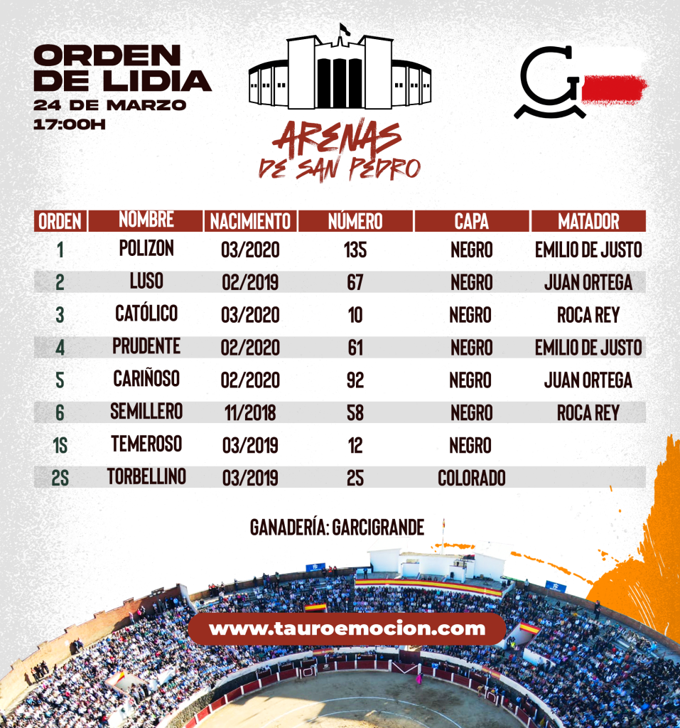 Actualidad Taurina Polizón abre la tarde en Arenas de San Pedro 24 marzo, 2024 FacebookTwitterPinterestWhatsApp Orden de lidia Arenas de San Pedro Sorteados y enchiquerados los toros de Garcigrande para los diestros Emilio de Justo, Juan Ortega y Roca Rey. El festejo dará comienzo a las 17.00 horas