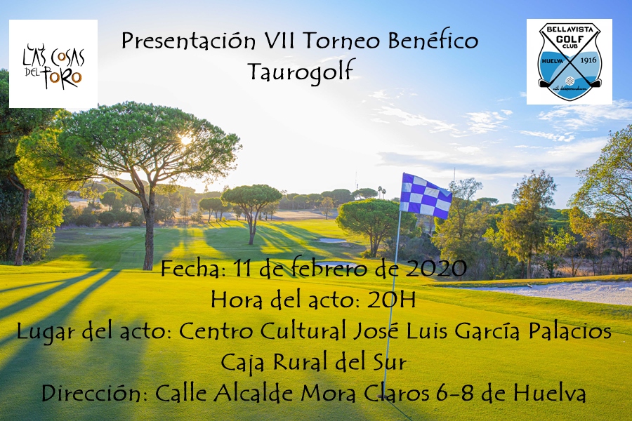Por la presente comunicamos la presentación de la VII edición del torneo benéfico de Taurogolf, el acto tendrá lugar el próximo martes 11 de febrero a las 20,00 horas en el Centro Cultural José Luis García Palacios de la Caja Rural del Sur, sita en la calle Alcalde Mora Claros 6-8 de Huelva Capital.