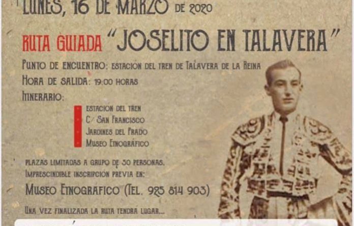 Comenzando a las 19.00 horas con una ruta guiada por los lugares que recorrió el maestro de Gelves aquella tarde del 16 de mayo de 1.920 en Talavera de la Reina. El punto de encuentro será la estación del tren que apeó a Joselito en el andén de la ciudad de la cerámica; posteriormente, la ruta transitará la calle de San Francisco y los Jardines del Prado, para terminar en el Museo Etnográfico. Hay que señalar que esta ruta tiene un número de plazas limitadas y que, para hacer la reserva, hay que dirigirse al propio Etnográfico o bien llamar por teléfono al número 925 814 903.