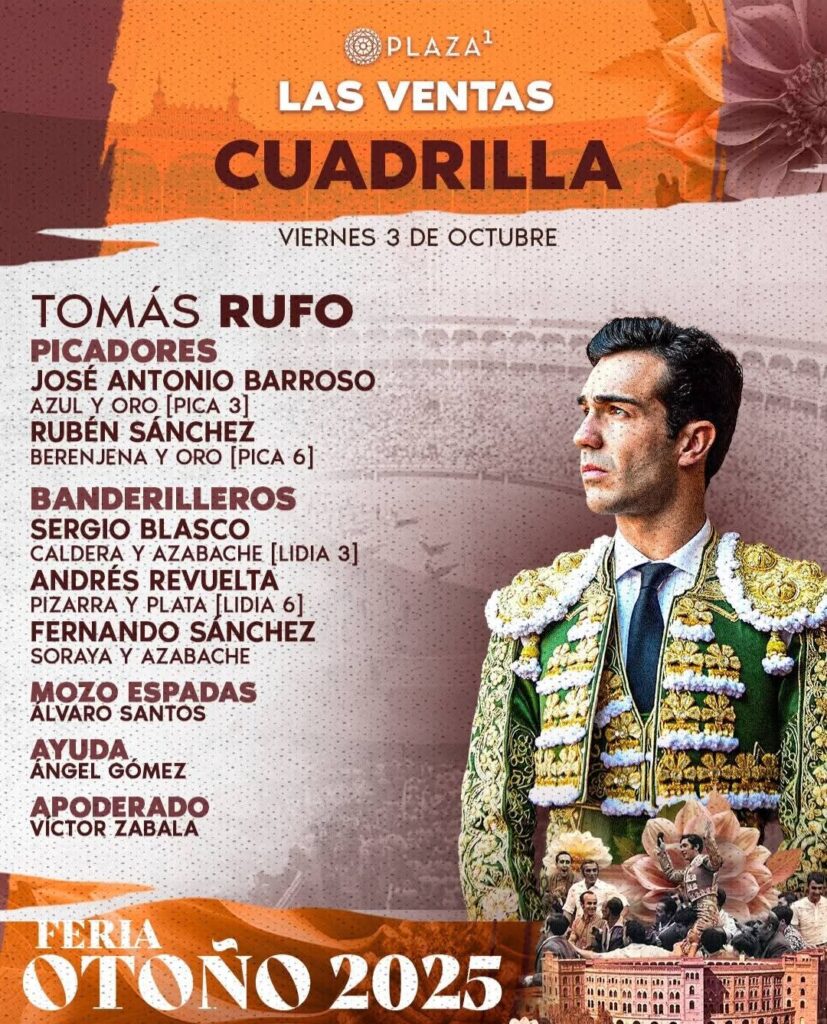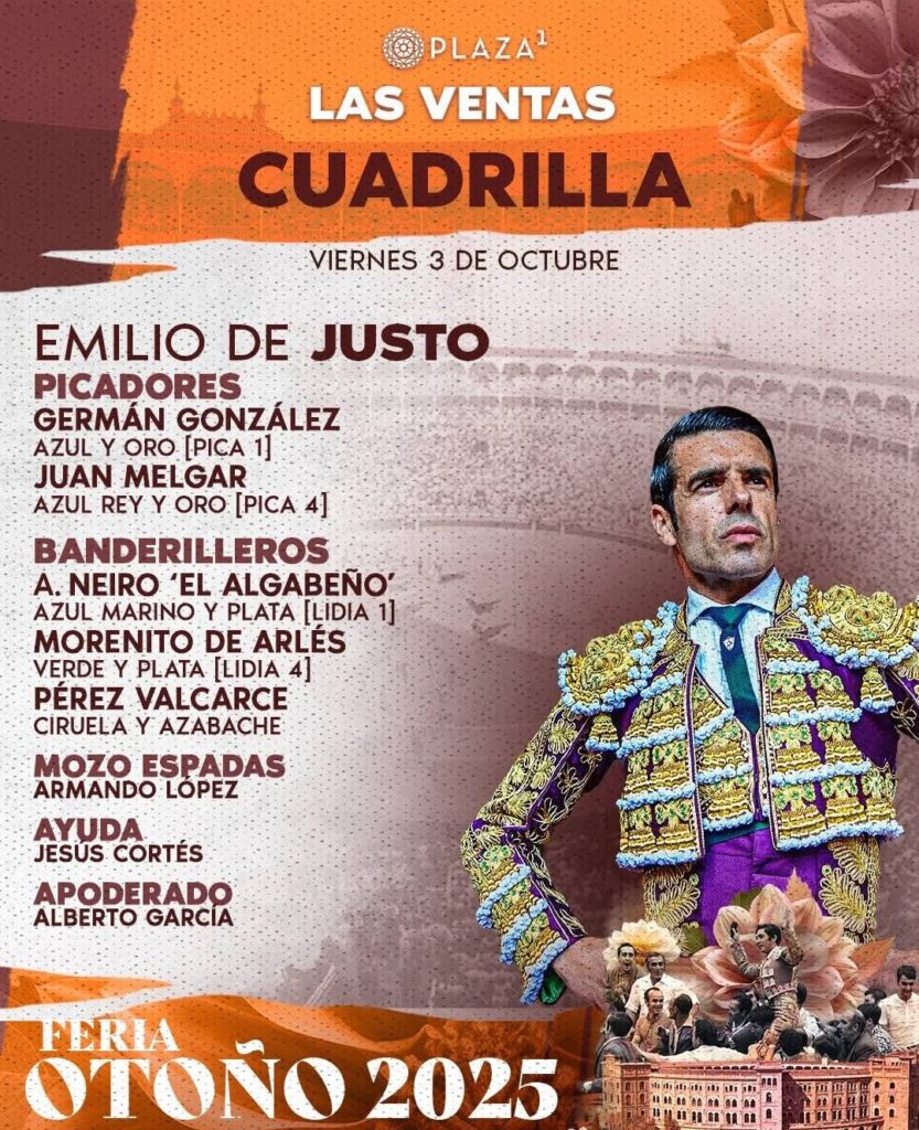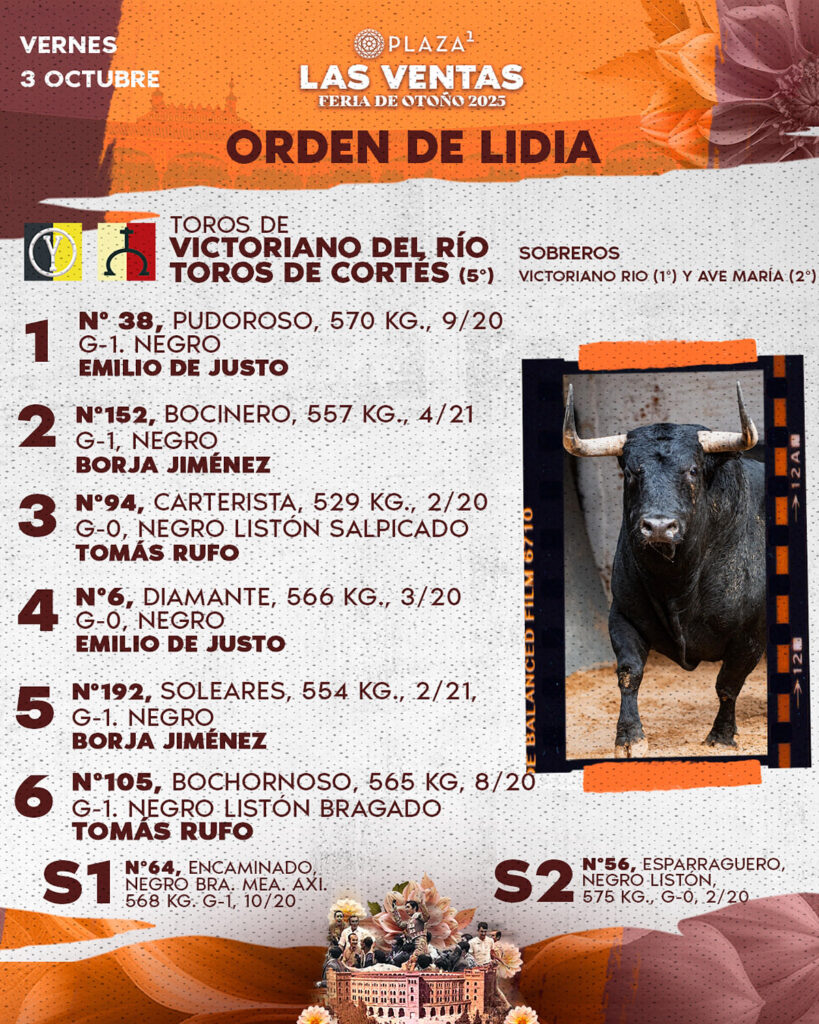 Ya han sido sorteados y enchiquerados cinco toros de Victoriano del Río y uno de Toros de Cortés para la segunda cita de la Feria de Otoño. Esta tarde, en en la Plaza de Toros de Las Ventas, a las 18h., serán lidiados por Emilio de Justo, Borja Jiménez y Tomás Rufo.