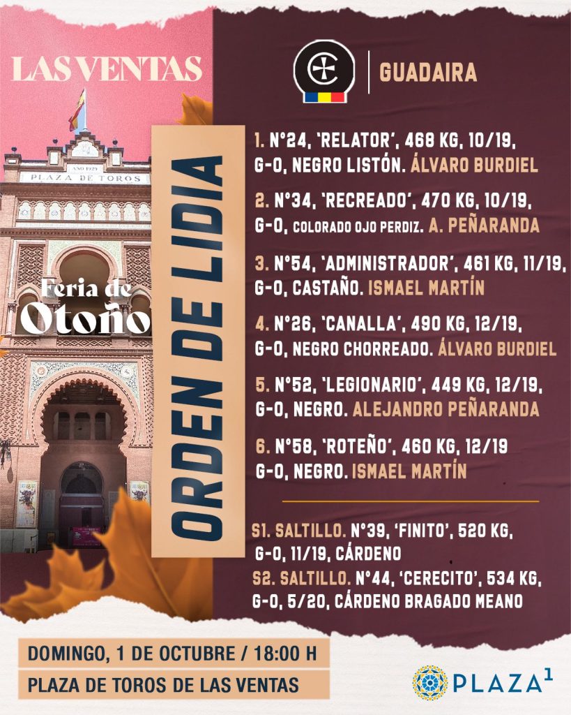 Ya se encuentran en los corrales de la Plaza de Toros de Las Ventas los novillos de Guadaira que se van a lidiar esta tarde. A las 18:00h. comenzará la primera novillada de la Feria de Otoño y en ella harán el paseíllo Álvaro Burdiel, Alejandro Peñaranda e Ismael Martín, que se presenta.
