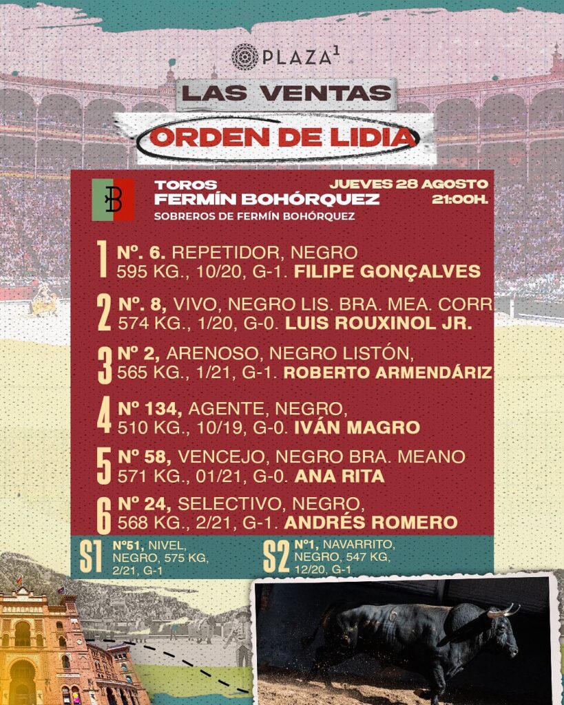 Sorteados y enchiquerados los Toros de Fermín Bohórquez para Filipe Gonçalves, confirmación, Roberto Armendáriz, Iván Magro, Ana Rita, Andrés Romero y Luís Rouxinol Jr., confirmación.