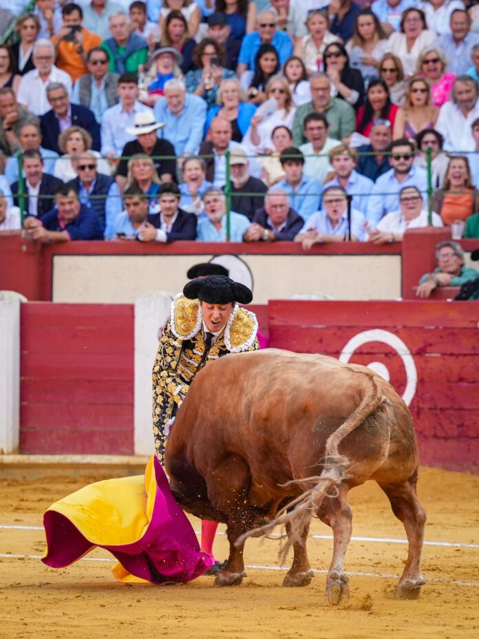 Roca Rey sufrió una voltereta en un inicio dramático. El toro puso en apuros a la cuadrilla en banderillas pero el peruano se rehízo con poder por el pitón derecho, imponiéndose con una faena épica, de entrega total, que levantó al público.