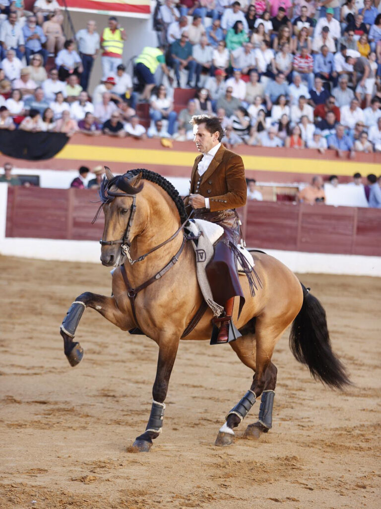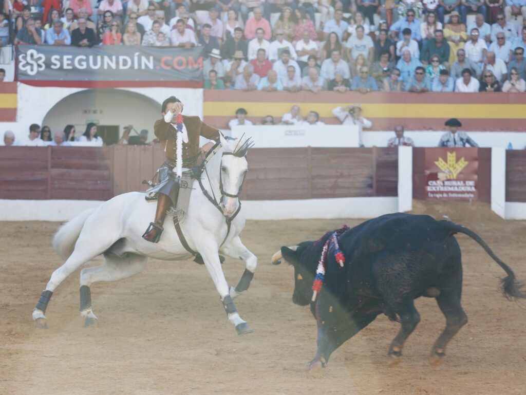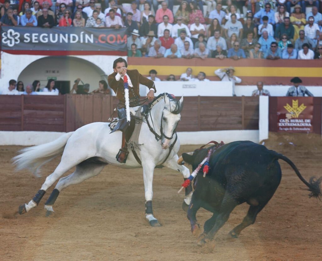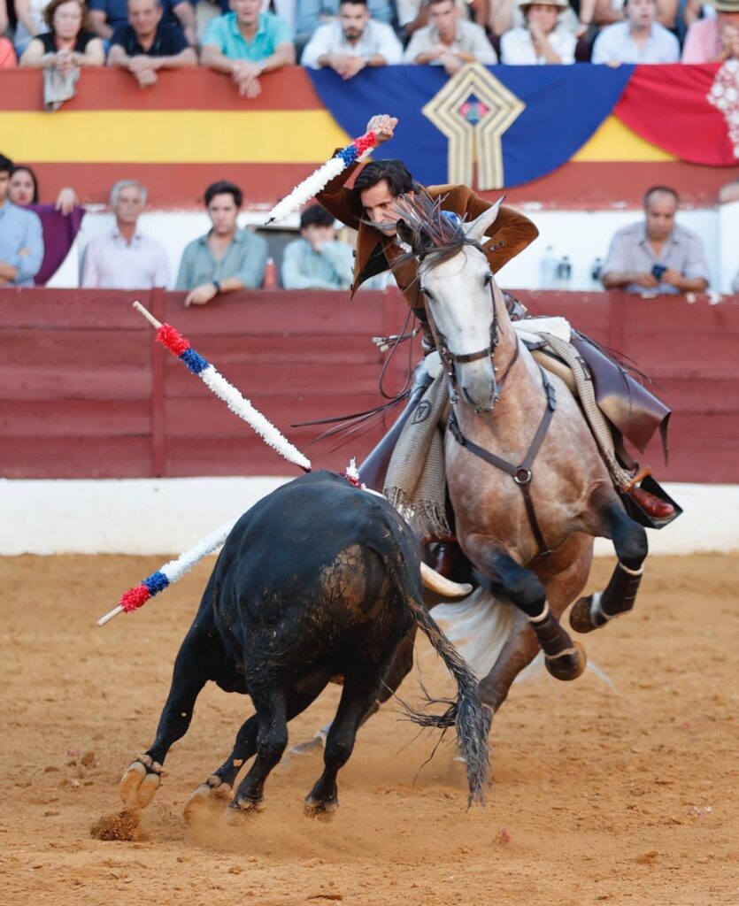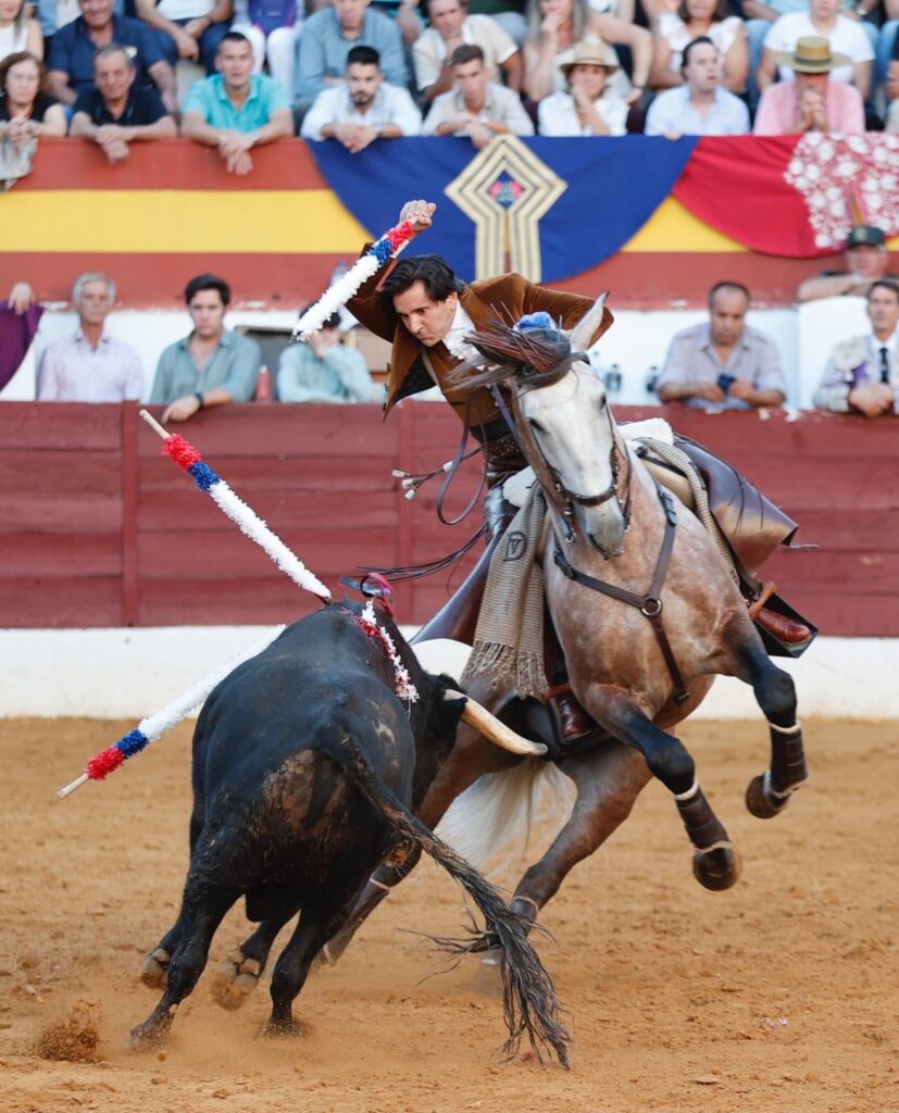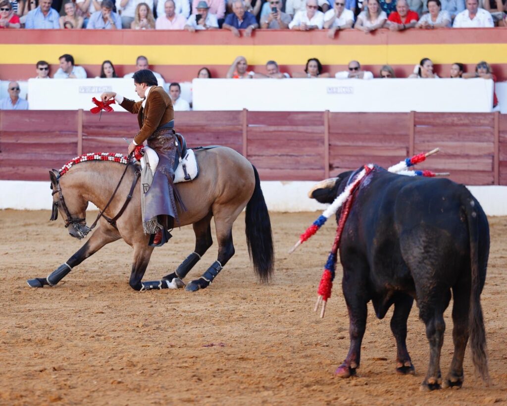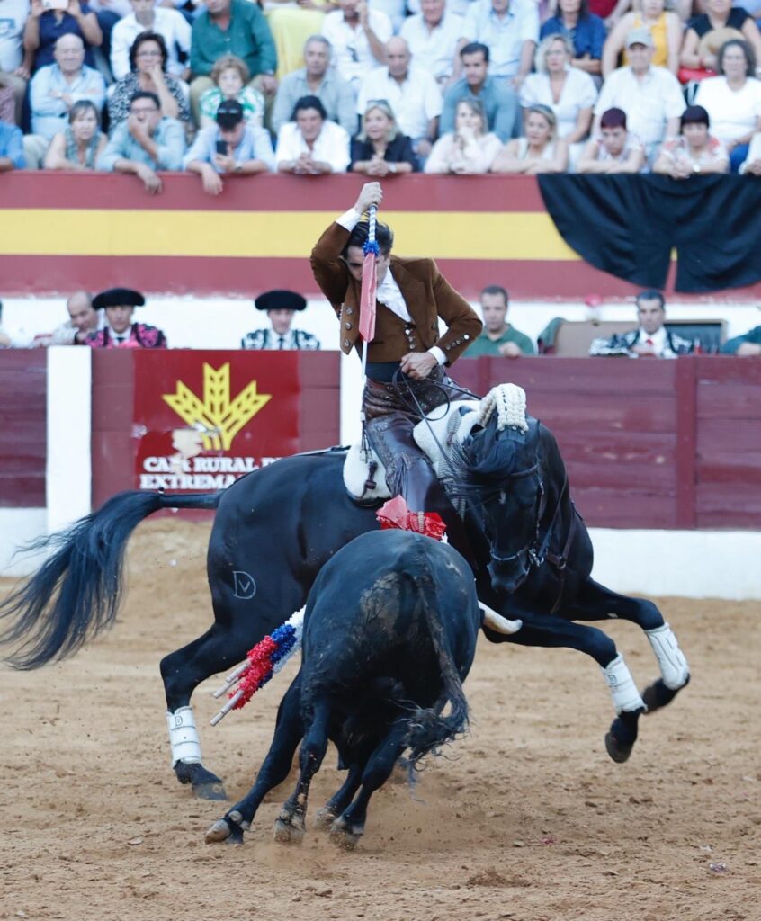 Redondea a lo grande su tarde 𝘿𝙄𝙀𝙂𝙊 𝙑𝙀𝙉𝙏𝙐𝙍𝘼 ante su segundo, colaborador, con el que el genio construye otra faena total. Desde el recibo con 𝘊𝘩𝘪𝘢𝘥𝘰, acariciando ya las embestidas para potenciarlas… Como después con 𝘘𝘶𝘪𝘳𝘪𝘤𝘰, ya en banderillas, temple innato y puro para embeber esas embestidas ya en el toreo de costado e imprimirles el ritmo exacto. Las hermosinas fueron como un muleteo de seda de gran belleza. El tarro de la pasión lo desbordó con 𝘘𝘶𝘪𝘵𝘢𝘴𝘶𝘦ñ𝘰𝘴 en dos palos al quiebro tan diferentes como mágicos. Muy en corto el cite en los dos. A caballo parado el primero, en los medios, y parando el tiempo en el justo momento del embroque, con la cabalgadura quedándose en él. Como si volara. El segundo, completamente cerrado en tablas, apenas a dos metros, luciendo el cite con un vibrante balanceo que detuvo justo para quebrar y clavar, otra vez, sin moverse un ápice del mismo espacio. Una locura. Un prodigio, que remató tras la pega de los forcados de Aposento de Moita con el rejón con 𝘖𝘳𝘰 𝘕𝘦𝘨𝘳𝘰 y un descabello y la petición unánime del doble trofeo.