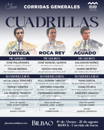 Los espadas Juan Ortega, Roca Rey y Pablo Aguado harán el paseíllo.
