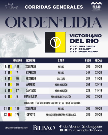 Sorteados y enchiquerados los toros de Victoriano del Rio para la tarde de hoy en Bilbao.