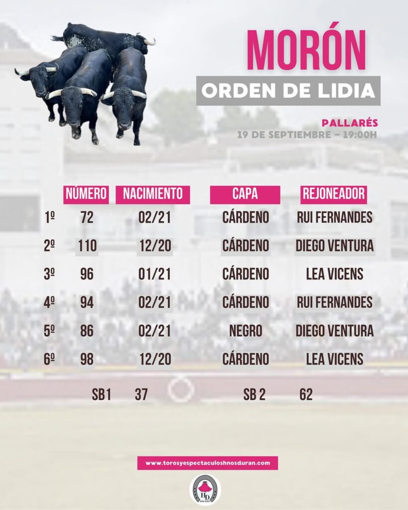 Orden de lidia de los toros de la ganadería 𝗣𝗔𝗟𝗟𝗔𝗥𝗘𝗦 para el día de hoy en Morón.