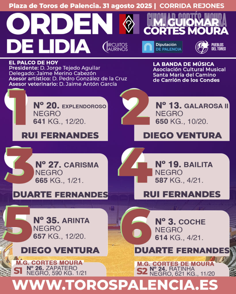 Actualidad TaurinaReseña Festejos Sorteo de los astados de Cortés de Moura para Palencia 31 agosto, 2025 FacebookTwitterPinterestWhatsApp Screenshot Se anuncian los rejoneadores Rui Fernandes, Diego Ventura y Duarte Fernandes Orden de lidia y cuadras de caballos