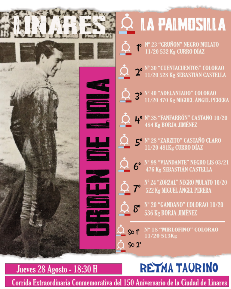 En la mañana de hoy se han sorteado y enchiquerado los toros de La Palmosilla, que componen la primera corrida conmemorativa del 150 aniversario de la ciudad de feria en Linares, a partir de las 18.30 Horas harán el paseíllo Curro Díaz, Sebastián Castella, Miguel Ángel Perera y Borja Jiménez.