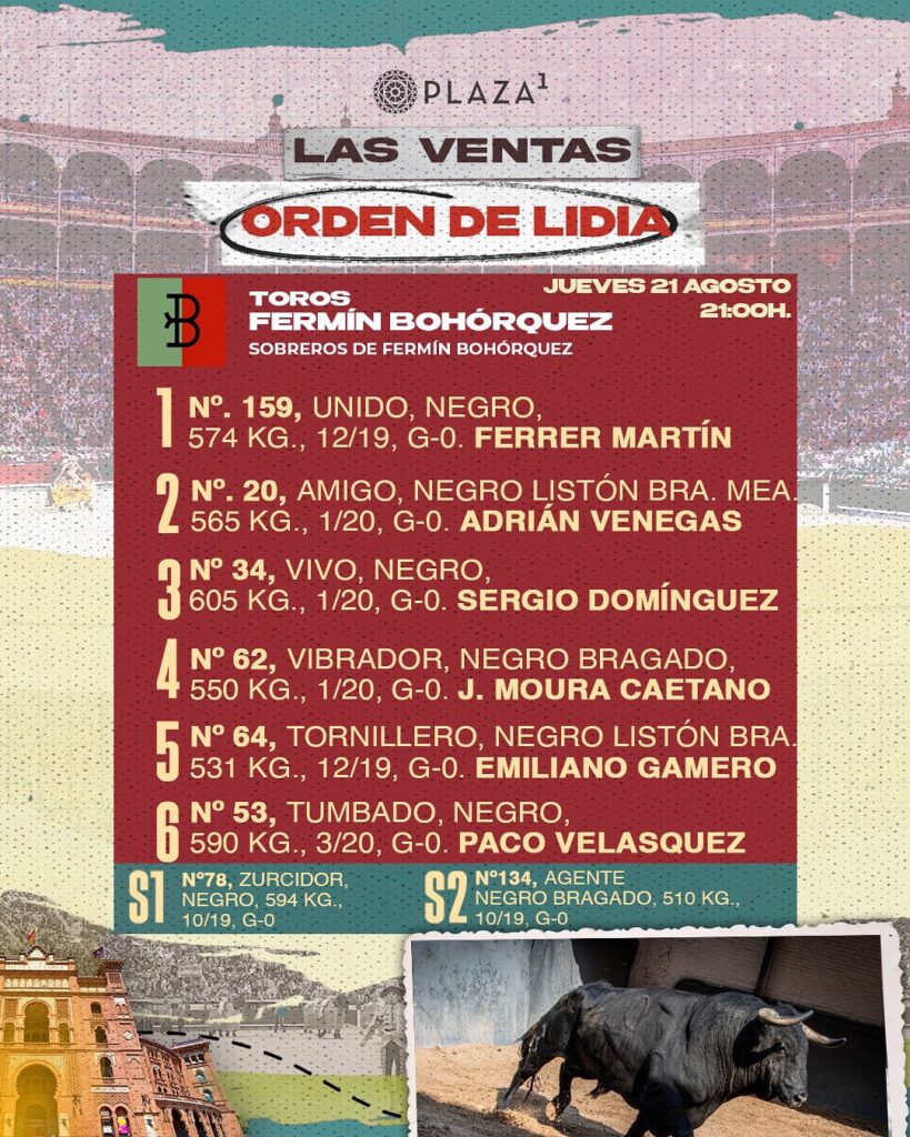 Seis toros de Fermín Bohórquez aguardan ya en los chiqueros de la Plaza de Toros de Las Ventas para la primera de las dos corridas de rejones programadas para este mes de agosto. Esta noche, a las 21:00h., harán el paseíllo Sergio Domínguez, Joao Moura Caetano, Emiliano Gamero, Ferrer Martín, que confirma alternativa, Paco Velasquez y Adrián Venegas, que también confirma alternativa.