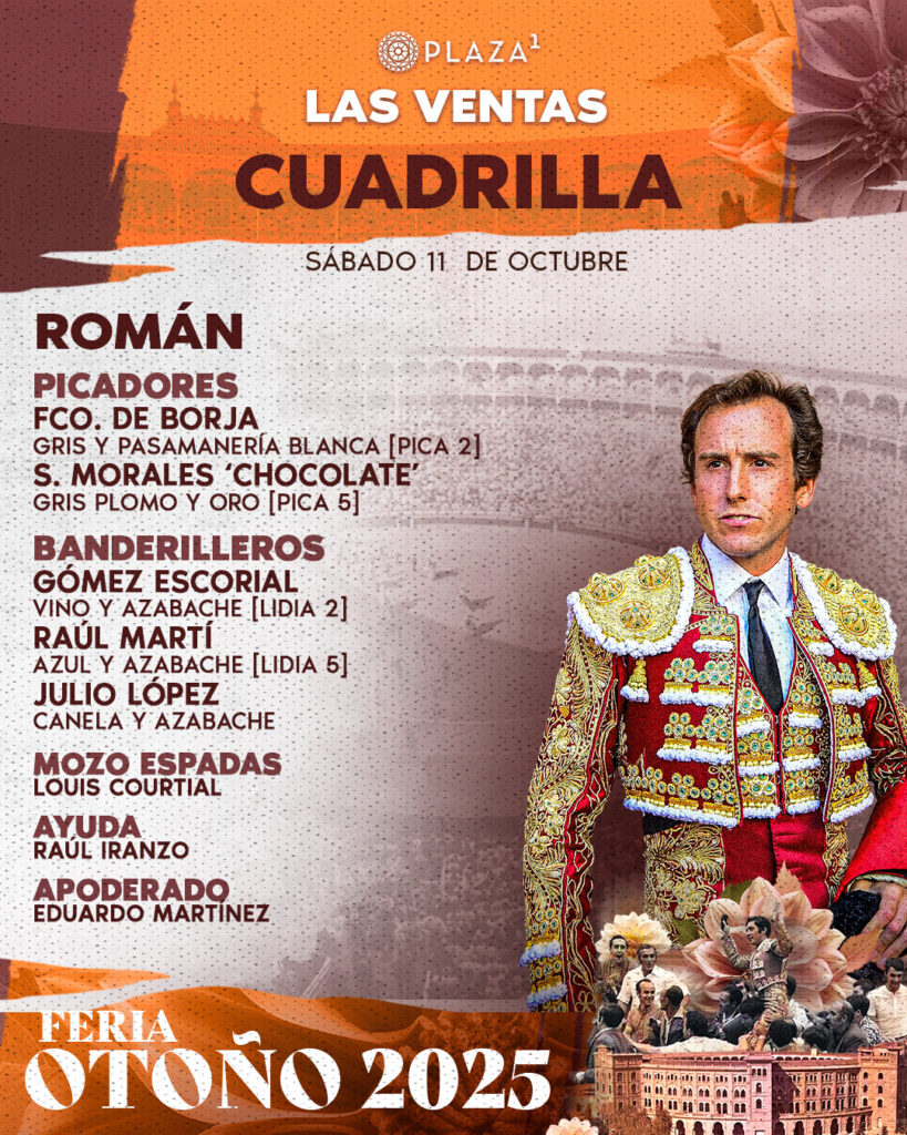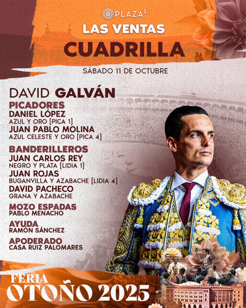 Actualidad Taurina «Verdadero» abre la tarde en las Ventas 11 octubre, 2025 FacebookTwitterPinterestWhatsApp Seis toros de la divisa de Victorino Martín aguardan ya en los corrales de la Plaza de Toros de Las Ventas para la séptima cita de la Feria de Otoño. Esta tarde, a las 18h., serán lidiados por David Galván, Román y Ginés Marín.